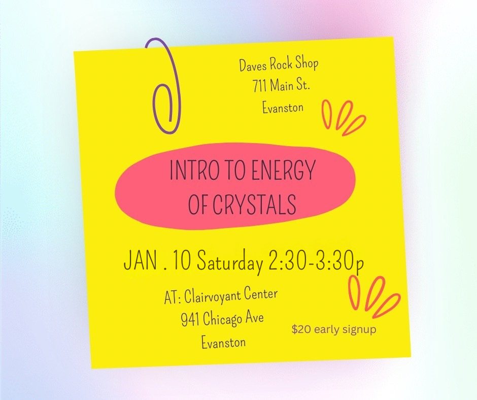 Introduction to Crystals workshop. Jan. 10, Sat. 2:30-3:30pm At: 941 Chicago Ave, Evanston. Early reg. by Jan. 7. $20 (Regular $35) Host: Dave’s Rock Shop